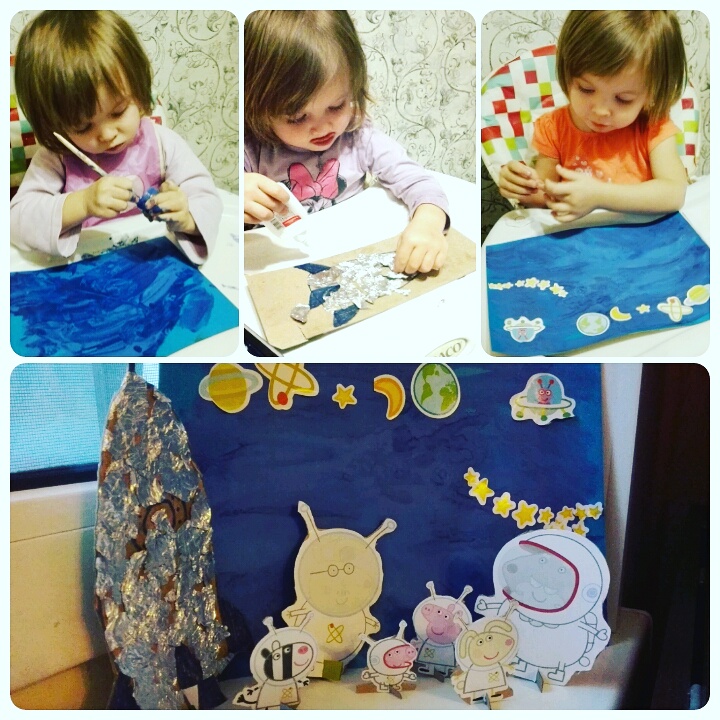 Приобрела журнал свинка Пеппа. Ничего интересного в нем не было, разве что идея аппликации с фольгой. Совместными усилиями сделали кукольный театр из наклеек, которые были в комплекте.
