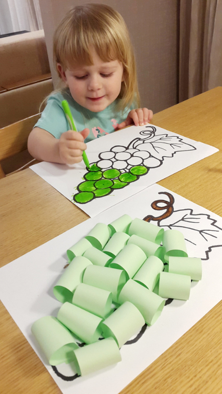 Мистер Умелец или Очумелые ручки (поделки, аппликации, интересные находки, идеи и задумки)мы любители винограда, но как-то не творили на эту тему никогда. Скачала в интернете просто контур виноградной грозди, который Маша старательно закрасила фломастером от и до. Меня иногда такая старательность и усидчивость поражает. А потом мы еще наделали объемных колечек и приклеили их к листу обычным ПВА. Получился целый урок про объемное и плоское!