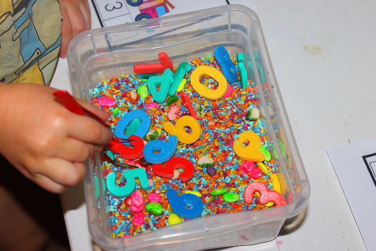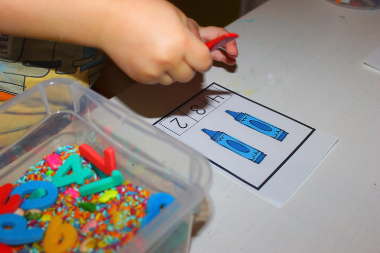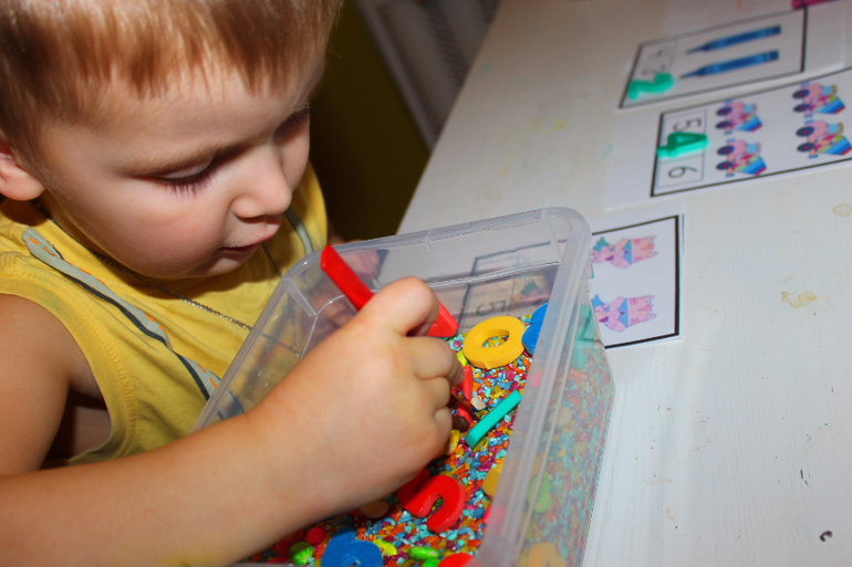 На картинке считаем изображения и находим нужную цифру в коробочке. Для Саши нужно было не цифру достать,а нужное количество фасолин. Оба ребенка работали пинцетами.