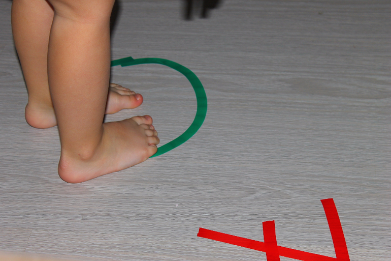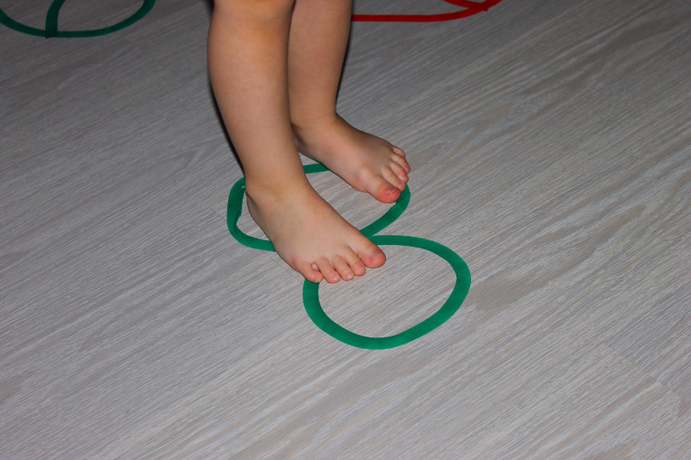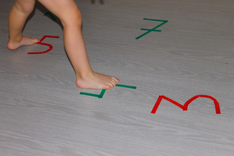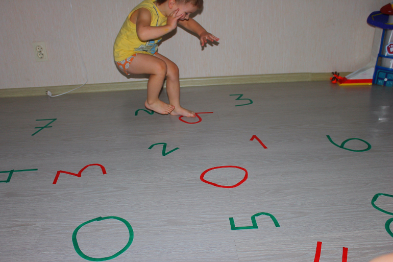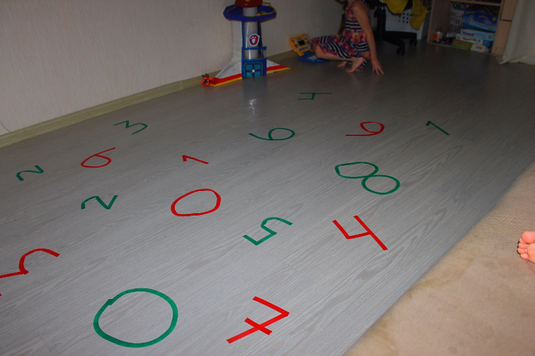 Саше задания были усложненные,я называла сложные числа (87,49,214,358, и пр.),ее задача была определить из каких цифр состоит число и поочередно наступить на нужные.