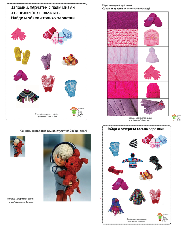 Задания с зимней одеждой, играть с нашими варежками и перчатками, разложить по парам, ну и печатные немного: