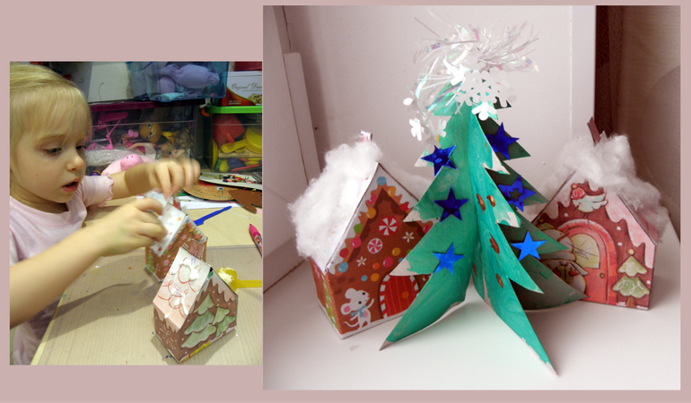 Поделка - зимний домик Дарёнки и Коковани. Можно сделать с помощью распечаток с кэнон . Там полно домиков, мы уже делали парочку ранее, вот что получалось: