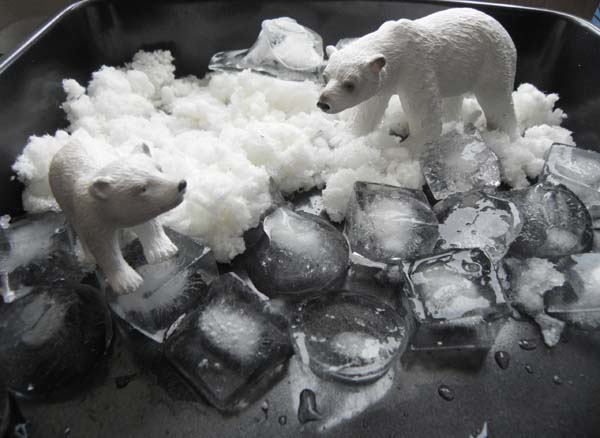 Сенсорная коробка - снег + кубики льда с белыми медведям. Вот так у нас было в прошлом году (снег из наполнителя от подгузника + вода):
