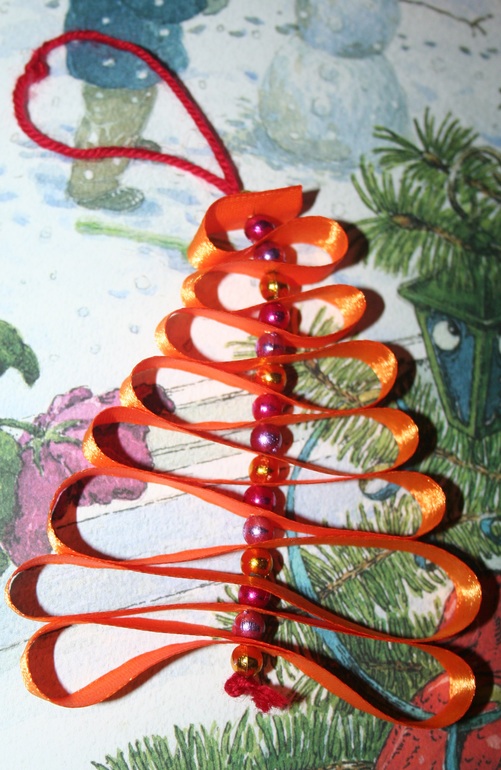 Все, что понадобится, чтобы сделать такую красивую елочку это - ленточка, бусинки и нитка с иголкой. Способ изготовления прост и банален: складываем ленточку половинками восьмерки, на нитку надеваем первую бусинку и делаем первый прокол. Еще одна половинка восьмерки с другой стороны, еще одна бусинка и следующий прокол. И так постепенно снижая длину восьмерок формируем силуэт елочки. При желании ленточки тоже можно украсить бусинками, но у меня с такими толстыми дырочками не нашлось, и я использовала украшения только для ствола.