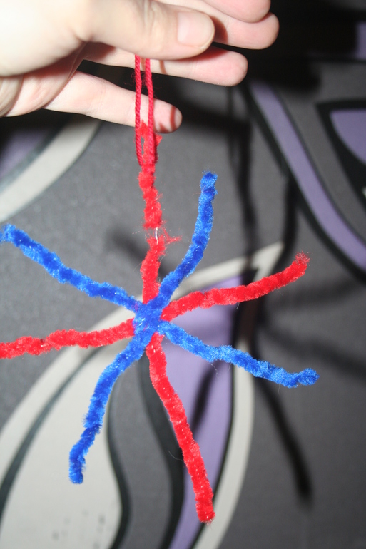 Понадобятся так же банка и синельная проволока. Для снежинки, наверное, лучше белая, но мы с Камиком скрутили вот такую.