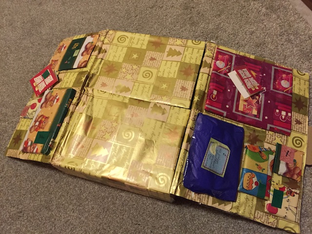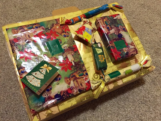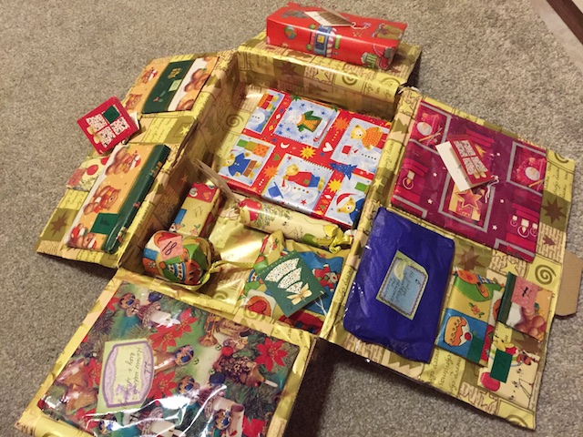 Это обычная коробка для пересылки (у нас обычно с Амазона такие приходят), со всех сторон обклеена подарочной бумагой, а сверху прикреплены разнообразные сверточки и открыточки с заданиями и пояснениями. Открываем, а там...