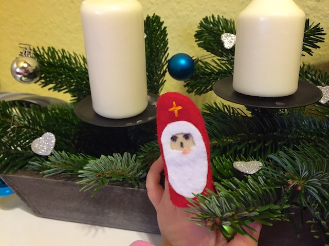 К началу ожидания Рождества я сделала для Насти такого пальчикового Николауса (немецкого деда Мороза), вот он выглядывает из-за еловой ветки: