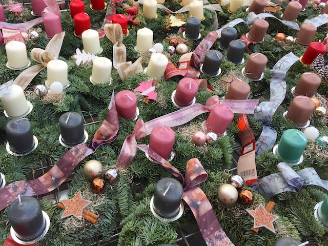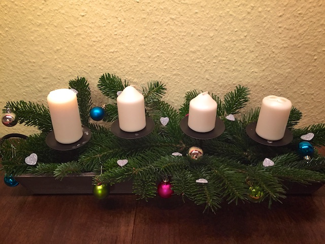 Это не тот венок, который многие знают по американским фильмам. В Германии тоже продаются венки-украшения и многие вешают их на дверь. Но адвент-венок имеет совсем другой смысл. Это религиозная христианская традиция, на венке обязательно должно быть четыре свечи - по одной на каждое адвент-воскресенье. Все они имеют определенное значение, но, если не вдаваться в религиозные тонкости, то это просто красивая традиция зажигать по одной свечке, потихоньку приближаясь к светлому рождественскому празднику.