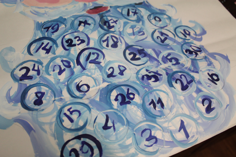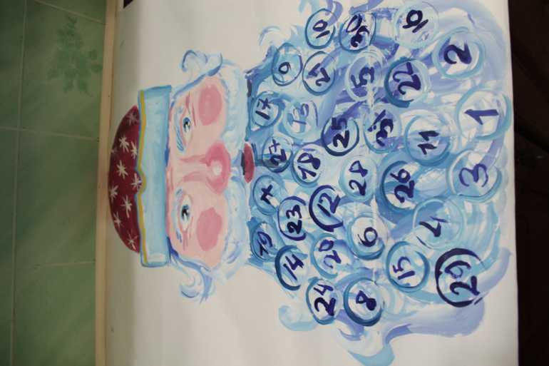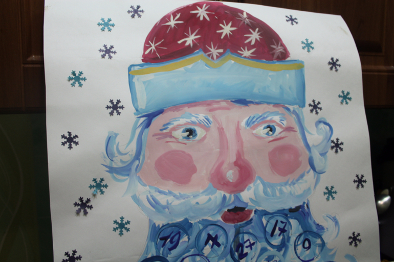 Это Дед Мороз, на бороду которому каждый день мы будем приклеивать вату для "мохнатости"))). Кружочки для ваты в итоге решила пронумеровать вразброс,чтобы Ева поискала))