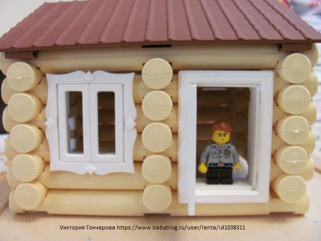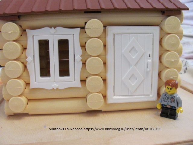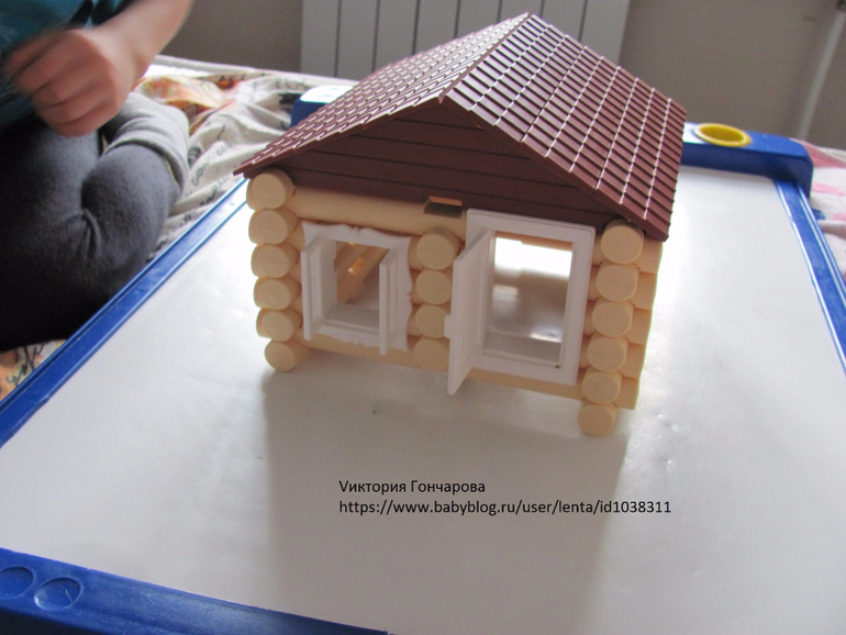 Что понравилось ребенку - бревнышки получаются как у нас на даче))), ну и как в книге про Муле Мека. Далее двери и окна открываются, имеется черепица в качестве крыши.