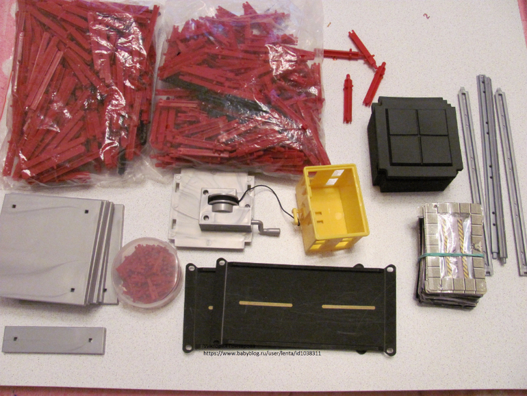 В набор входит - 186 реек, 230 балок, 28 стоек, 8 скошенных балок, 2 дорожных полотна, 25 элементов пола, 6 средних площадок, шкив, 4 направляющих лифта, лифт, 60 картонных панелей, иллюстрированная инструкция на русском языке