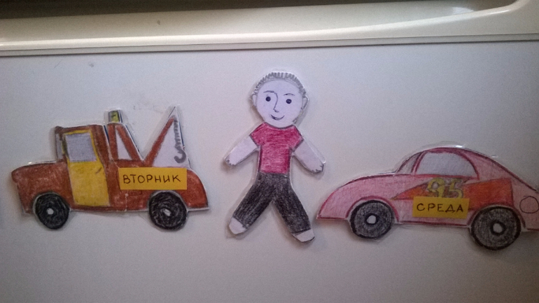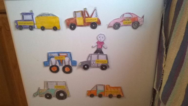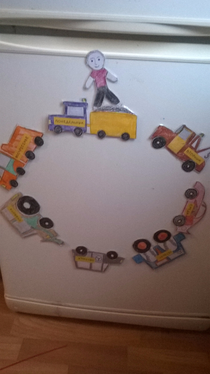 вот так дни недели ездят у нас по кругу по холодильнику, а мы с Елисеем пересаживаем человека каждое утро в следующий день и проговариваем:"Это вторник, был вчера, сегодня среда, а это завтра - четверг". Ну, а Ясёнка просто пока сбивает нам порядок, теряет машинки, проверяет ламинирование на прочность