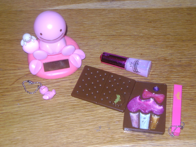 Детскую косметика и маятник-обыграла его,что это была любимая игрушка Эльфа,но он решил её подарить именно нашей девочке,что бы когда ей было грустно она смотрела на него и грусть обязательно пройдёт(маятник работает от солнечной батареи качает головой и улыбается)