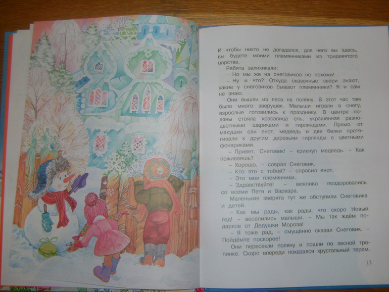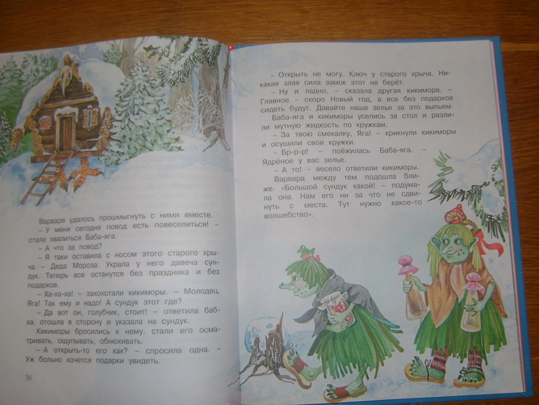 Книга Волшебный день очень понравилась именно иллюстрациями,по настоящему волшебными и новогодним,тут и леший и кикиморы и баба-яга,мудрая сова-все мистические персонажи,которые обязательно понравятся деткам)Текст читается очень легко,история интересная о том,как мальчик Петя и девочка Варя отправятся вместе со снеговиком искать сундук с новогодними игрушками,которые украла Баба-Яга)