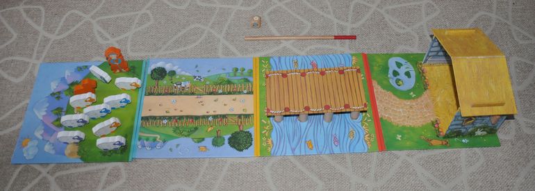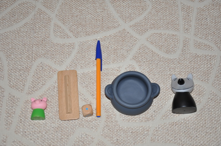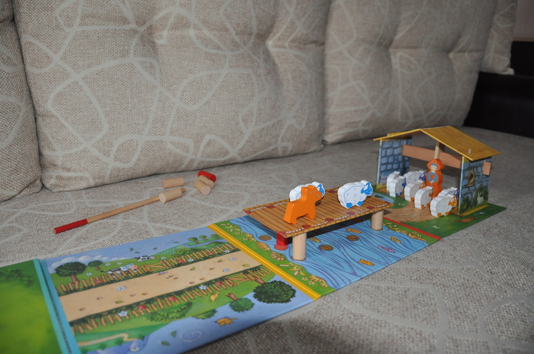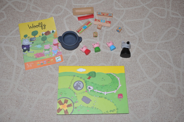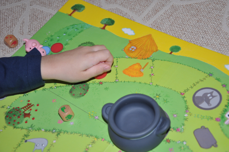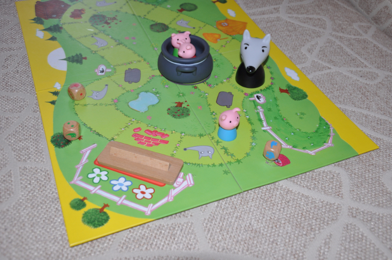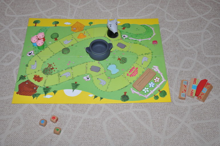Подготовка тут попроще - поросят выставляем на стартовые круги по цветам, волка - на свой стартовый круг, котелок - на огонь, фундамент дома - на красный прямоугольник: