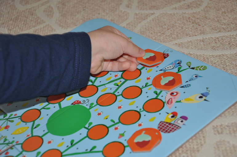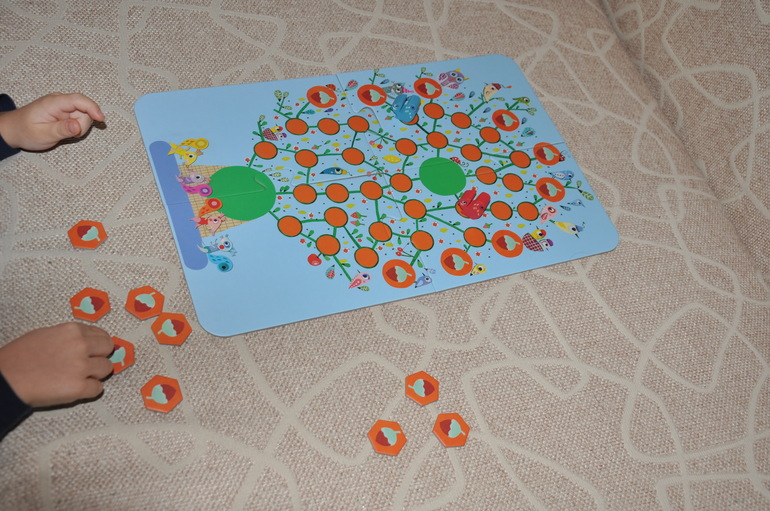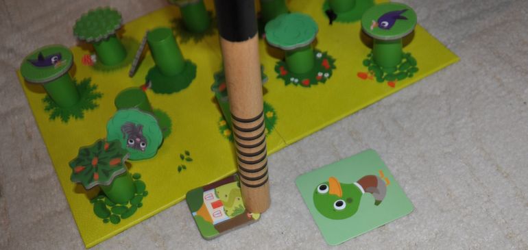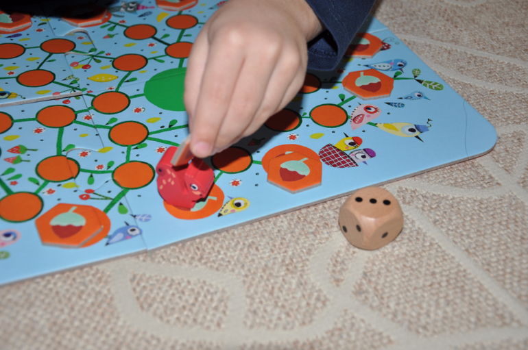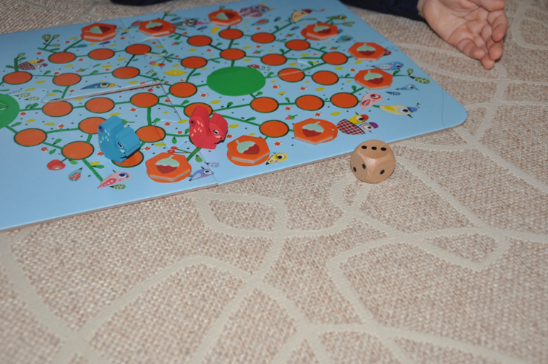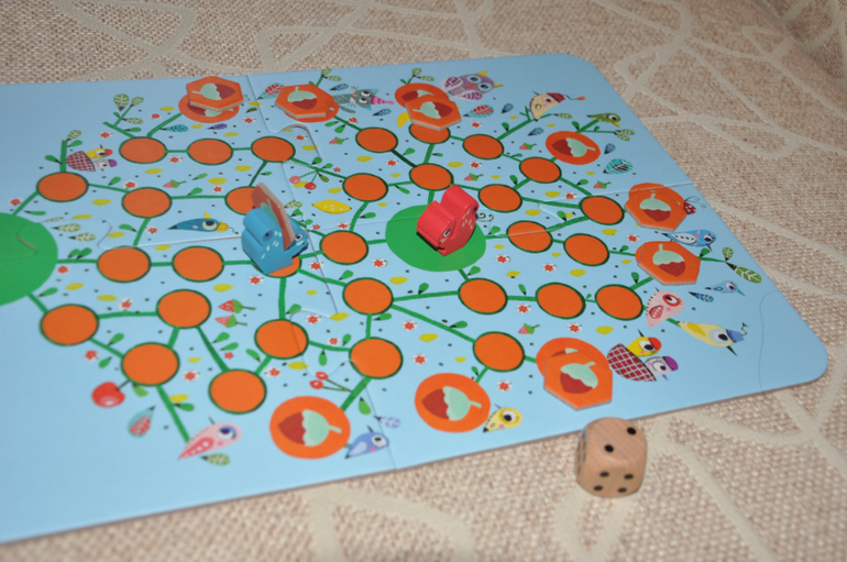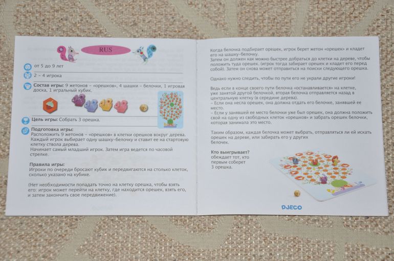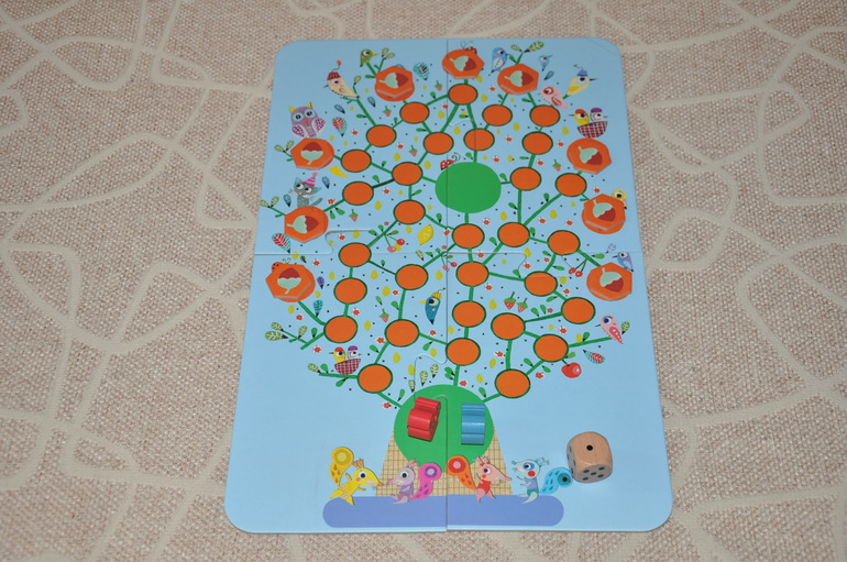 Из правил не очень понятно, куда белка должна стремиться, схватив орешек. Мы играем по-разному: для быстрой партии (как сегодня) - собираем орешки в середине дерева, а для чуть более длительной - на стартовой клетке.