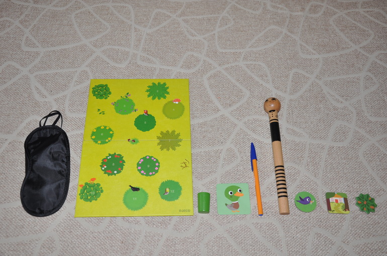 Затем ведущий надевает повязку на глаза, а остальные игроки раскладывают карточки с кронами деревьев по столбикам, кладут карточку "домик" с любой стороны поля, а также помещают фигурку персонажа в середину поля: