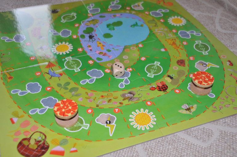 Основная изюминка игры в том, что фишка игрока, попадая на клетку "дождь", переворачивается вниз картинкой с лягушкой и вверх картинкой с зонтиком. А, если игрушки всех игроков "открыли зонтики" да еще и поменялись местами, попав на соответствующую клетку, то уже совсем не понятно, какая лягушка, где и можно запросто привести к финишу чужую лягушку! Получается очень весело и непредсказуемо!))