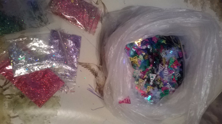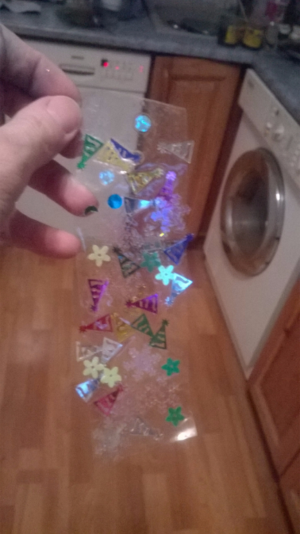 нужен скотч, на его клейкую сторону приклеивается всякая блестящая мелочь. вот, например, наш не заканчивающийся наборчик. по завершении "творчества" сверху красота закрывается вторым слоем скотча.