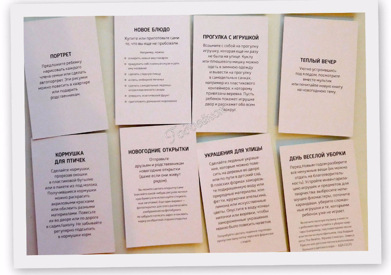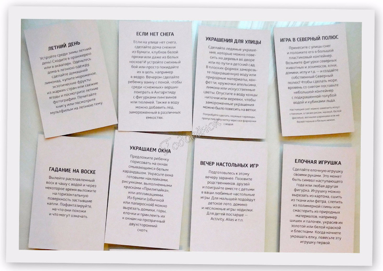 Карточки имеют размер 5,5*8,5 см. Картонные. Всего 40 карточек: на 34 написаны задания, а 6 карточек - пустые. Из пустых карточек: на трех (с изображением подарка) предлагают написать, где спрятан подарок, а на оставшихся трех - какие-то свои задания.