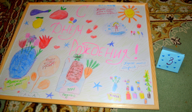 Делали подарок для Очень хорошего человека ) пожелания в картинках - здоровья пожелали, а чтобы его получить надо кушать полезную еду - морковку, баклажаны, яблоки и пр. ))) счастья в новом году пожелали, торт нарисовали со свечками завернутый в подарок (Саша рисовал),