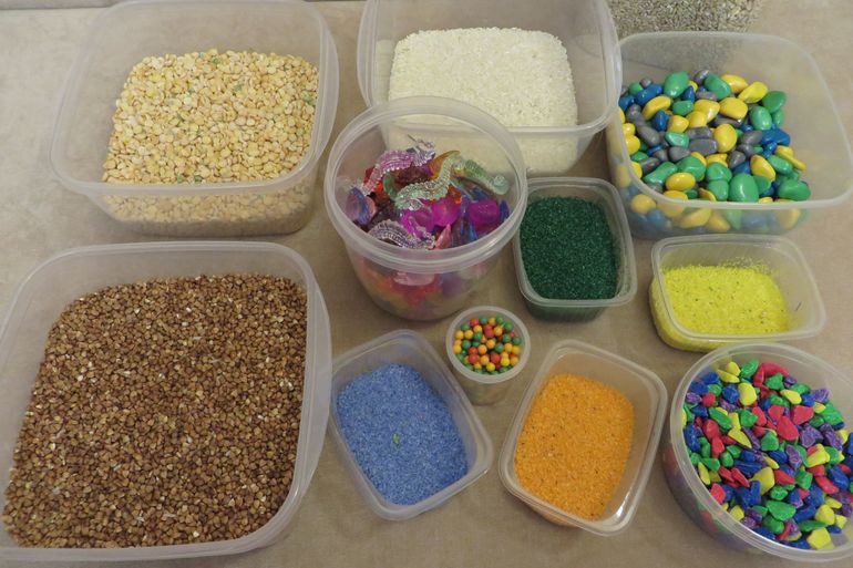 *** Крупы, цветной песок, галька *** Нужны не только как наполнители сенсорных коробочек, но и как основной материал для сыпучих аппликаций.