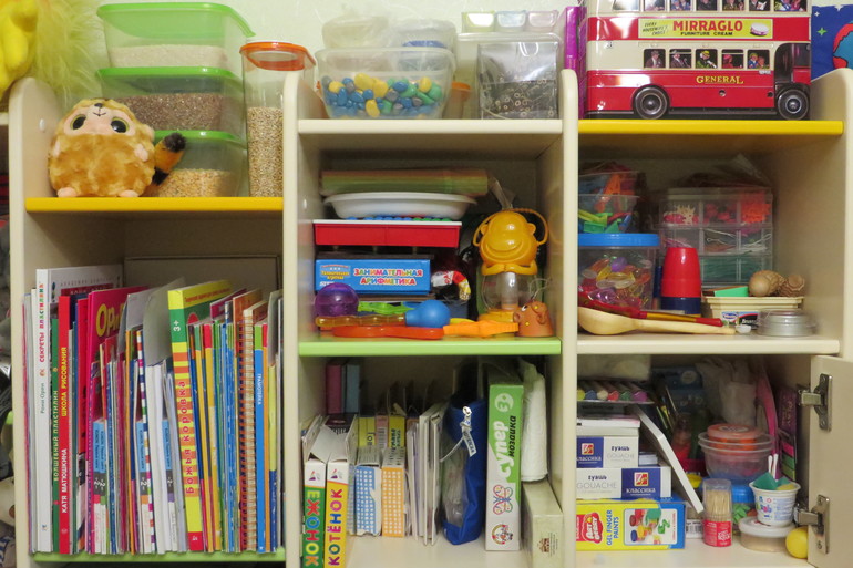 Занимают все мелочи несколько верхних полок в стеллаже у Лёни.