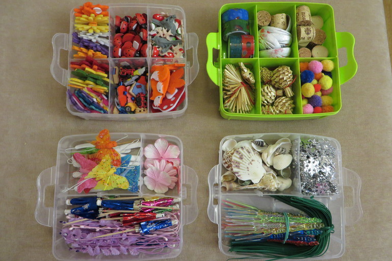 Для хранения материалов использую различные по размеру коробки, многоярусные кейсы, пакеты с застежкой Zip Lock. Вообще иногда достаточно просто выдать ребенку подобную коробочку, чтобы он был занят длительное время.