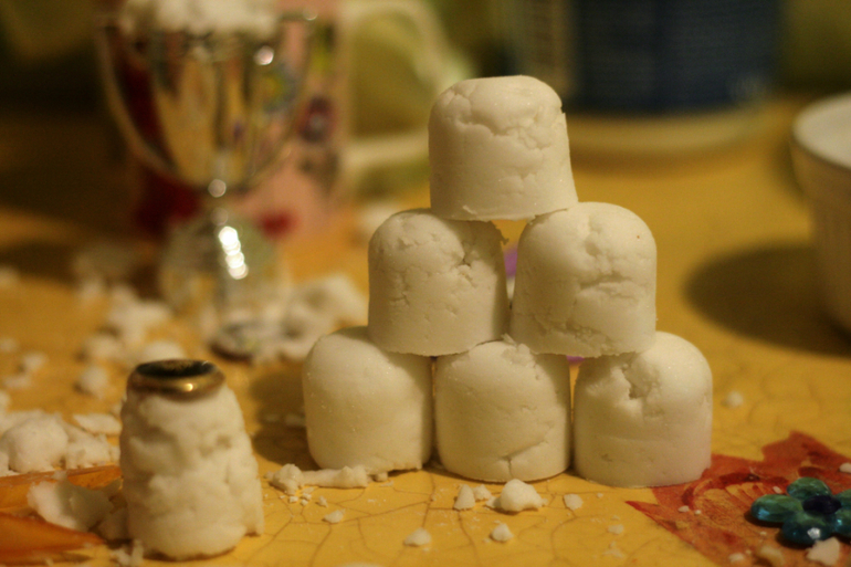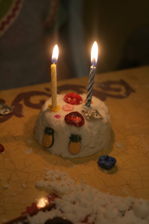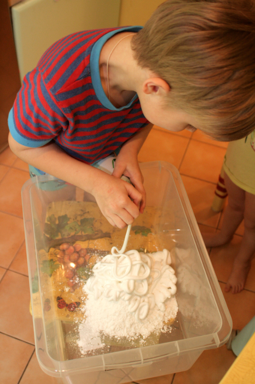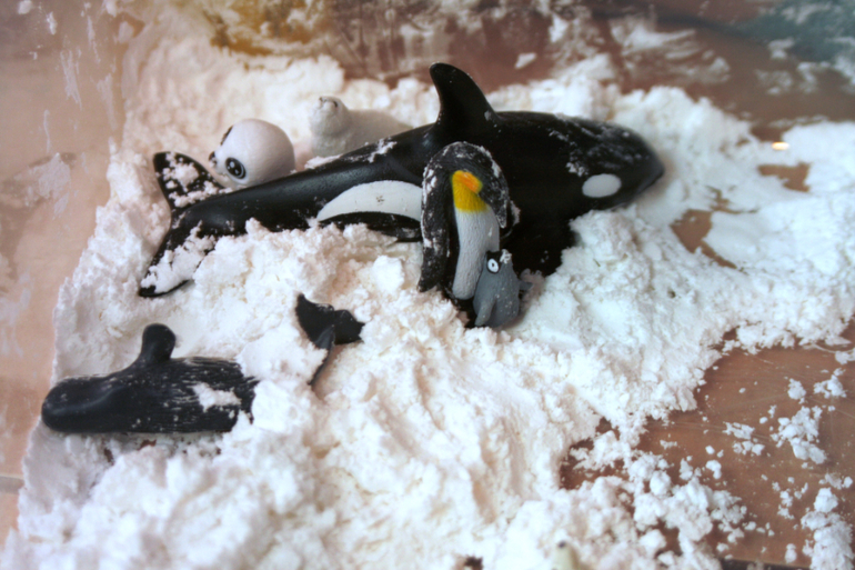 Пришлось в срочном порядке сочинять снег (крахмал+пена для бритья) - очень нежный и прохладный получился. Дети играют по сей день.