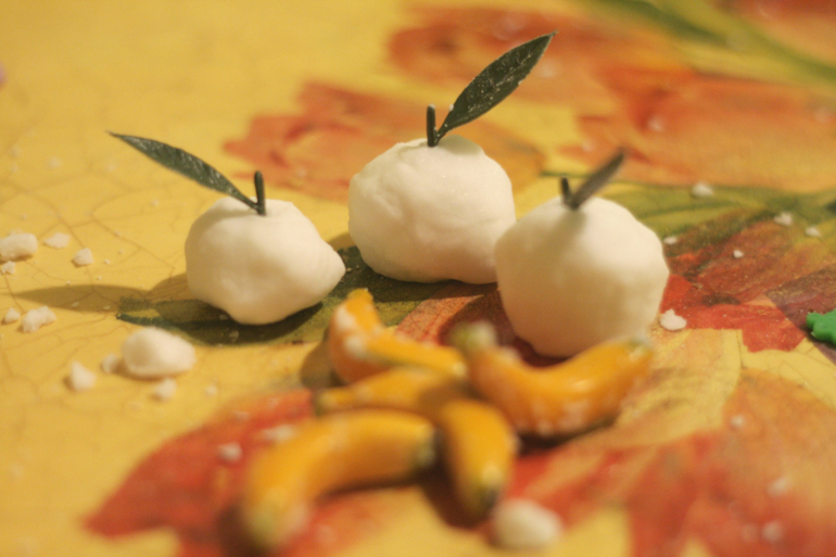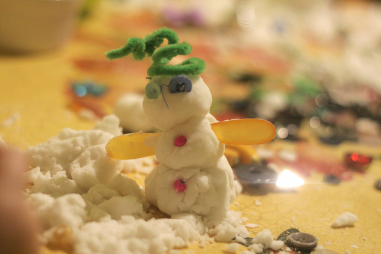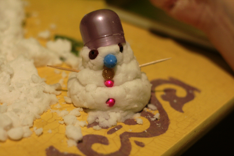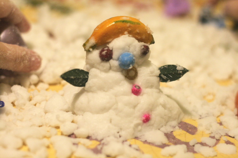 Парад снеговиков и очередная партия снега, теперь уже сода+крахмал+вода. Делали торт, яблоки, мороженное, снежные башни. Рекомендуем!