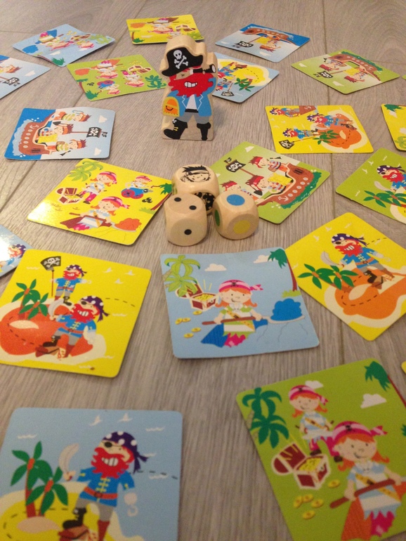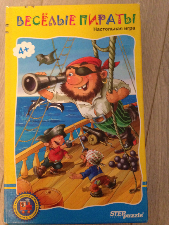 2) "Веселые пираты" из серии Дорожная игра от Степ-пазл. Игра недорогая, но качественная. 27 карточек, 3 кубика (с цветовым фоном, персонажем и количеством), фигурка капитана. Игра - кто быстрее найдет карточку, удовлетворяющую выпавшим комбинациям трех кубиков. Тоже игру покупала и начали играть, сыну было чуть больше трех лет. не мог сосредоточиться и искал очень медленно. к 4-м годам научился очень быстро искать, сопоставлять и даже меня обыгрывает) из этой серии у нас есть еще Микадо и Разноцветные гусенички, но они у сына спросом вообще не пользуются(