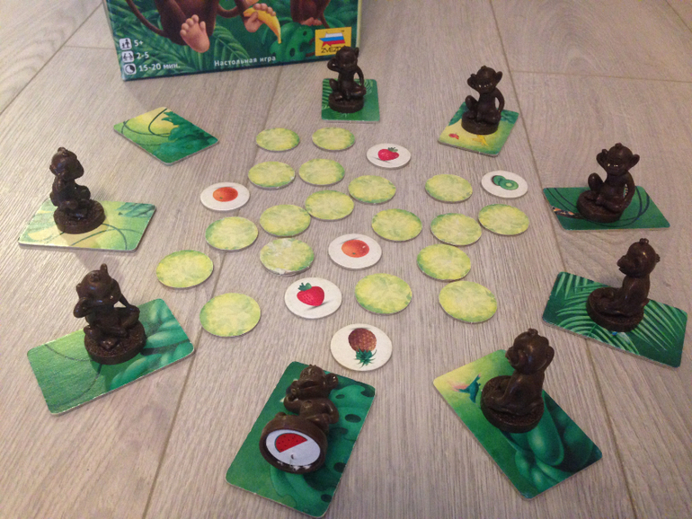 1) "Остров Обезьян" от компании "Звезда". Игра на развитие памяти. Обезьянки одинаковые, на основании каждой из них изображен определенный фрукт. Нужно его запомнить и накормить обезьянок , причем только теми фруктами, которые указаны на основании каждой обезьянки. Обезьянки с каждым ходом передвигаются на свободное место. Начали мы играть в эту игру, сыну было чуть больше трех лет , не запоминал вообще) я сокращала кол-во обезьянок и фруктов и до трех, и до четырех, но сын перфекционист и строго следует правилам)) поэтому должны стоять все восемь обезьянок и играть со всеми)) К 4-м годам стал запоминать лучше, может запомнить три обезьянки. я не люблю играть в эту игру, так как запоминаю всех , а сын начинает "гадать", но Арсений приносит ее очень часто))