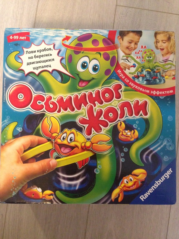 7) "Осьминог Жоли" от Ravensburger. Замечательная игра, качество на высоте (хочу их Бобер Билли). Расставляете крабиков на "горе", ставите осьминога, включаете его - щупальца движутся, вы пытаетесь пинцетом вытащить крабиков. Задеваете щупальца, осьминог останавливается и начинает хохотать от "щекотки". У Арсю пока не получается вытащить даже одного крабика и не задеть щупальца. Он долго примеривается, медленно тянет руку к крабу, аккуратно пытается его вытащить - осьминог хохочет. но игру любит. Нравится Жоли и младшему - достает включает и пытается тоже доставать пинцетом)