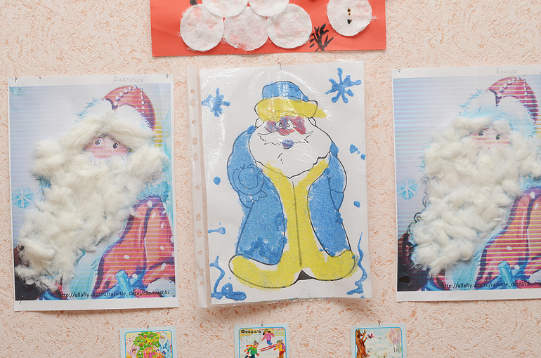 Прочитали про Деда Мороза. Сделали бороду ДМ и ваты. Разукрашивали ДМ. И аппликация с цветным песком.