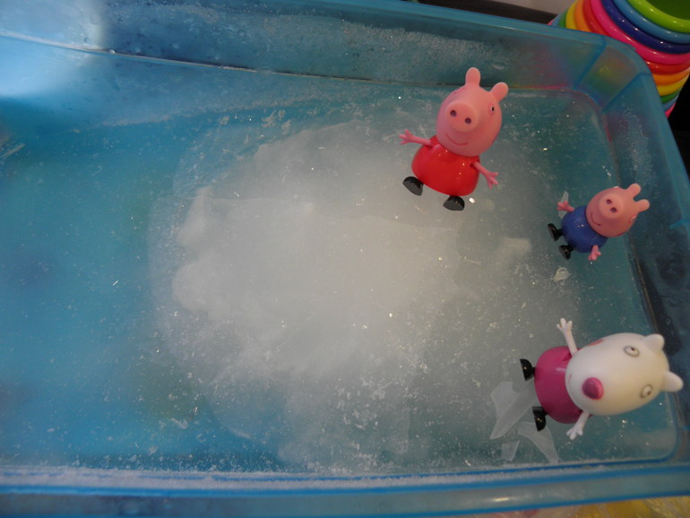 Сделать каток в миске - заморозить лёд и зверей в лотке, катать их.