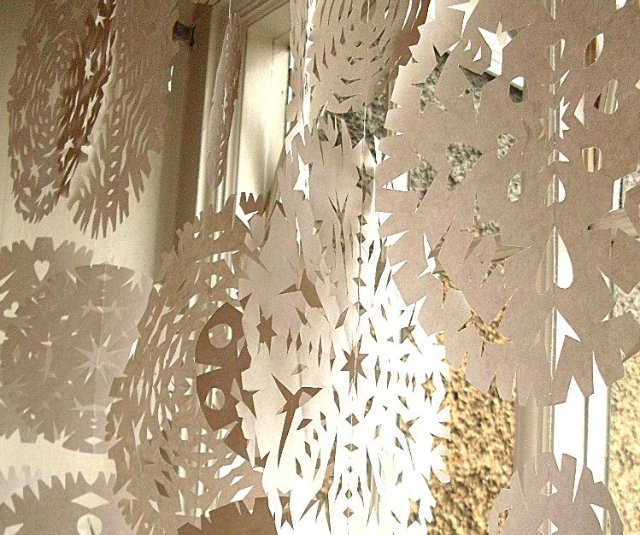 Сделать снежинки и украсить квартиру (белые снежинки на нитках), хочу так: