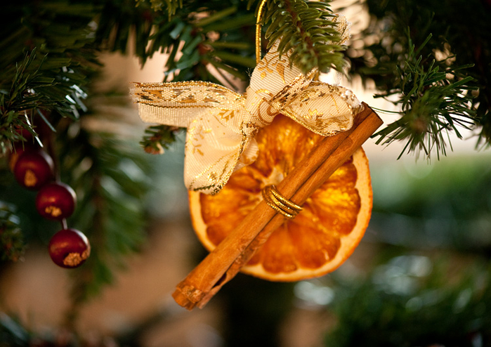 Зимний привет из Африки! Ёлочные игрушки- снежинки из засушенных в духовке апельсиновых и лимонным кружков. Вот например вариант с палочкой корицы, а мы сделали снежиночный вариант с клеем пва + блестки.
