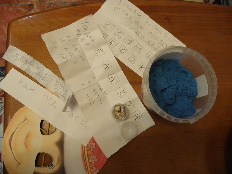 Тут начинается мини квест)))Странное дело, внутри вморожен контейнер, поливаем теплой водой, внутри контейнера записка: "ищи возле воды", все бегут в ванну. Находят записку "ищи под маской", под картонной маской обезьяны еще одна записка с шифром - слово "песок" -номера букв алфавита. В коробке с кинетическим песком еще одна записка-шифр слово "балкон" - надо вписать с помощью первых букв слов. Ну и на балконе оказываются игрушки - Свинка Пеппа и Кошка Кенди: