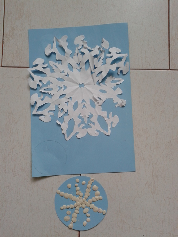 Вот большую снежинку я делала из офисной бумаги и честно - еле-еле её довырезала (из чего попроще-то вырезать что-то и не придумаю), наклеивала Соня. И нижняя снежинка это Сонино творчество, что, собственно, заметно, но зато сама.