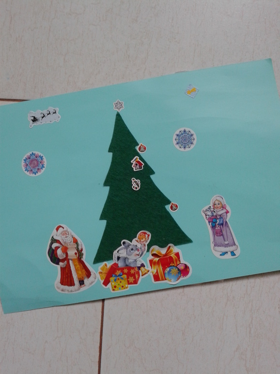 Эта ёлка из самоклеящегося фетра (наборы продаются в канцелярских отделах) плюс наклейки. Эта ёлка у нас не под настроение попала, поэтому так тяп-ляп, хотя ёлочка самая похожая с ворсиком.