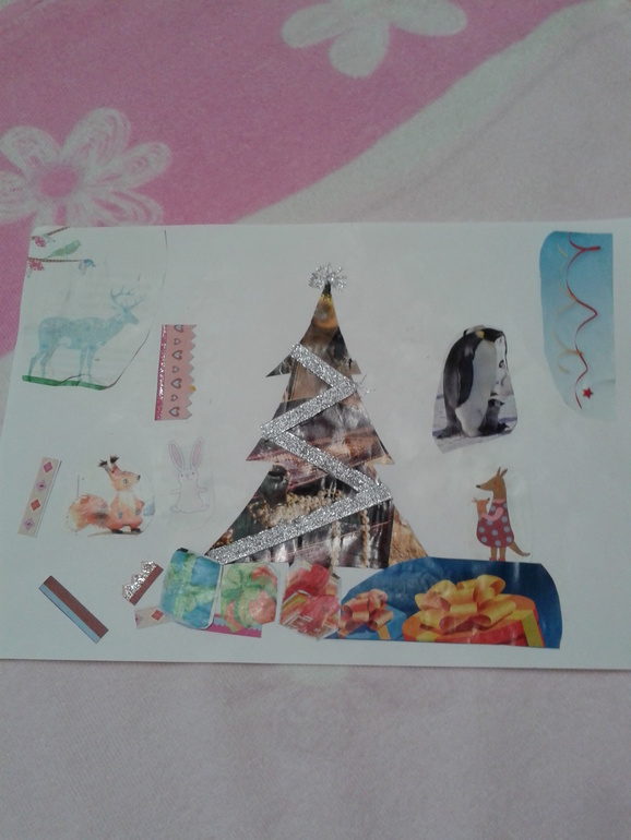 Это ёлка, вырезанная из журнала, серебряная полосочка - это тесьма, звезда тоже из нее, немного растрепали и прикостопыжили "звезду" на верх.