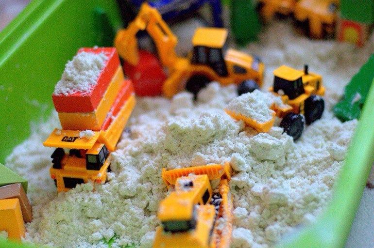 А можно узнать как сделать снег из крахмала+масло детское,какие примерно нужны пропорции?