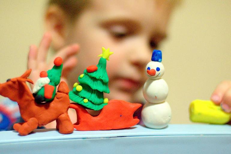 Ещё одно из заданий было "Налепить новогодних персонажей", я слепила оленя и гнома, отец снеговика и санки, Егор слепил ската😂😂 и самолет)