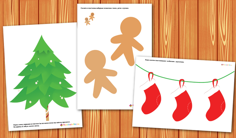 Лепка пластилином. Украшаем елочку, носочки. Делаем из пластилина глазки, ротик и пуговки для человечков.