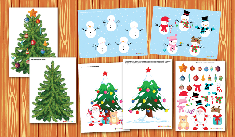 Аппликации. Украшаем елочку, ложим под елочку подарки, одеваем снеговичков. В помощь - листы-образцы.