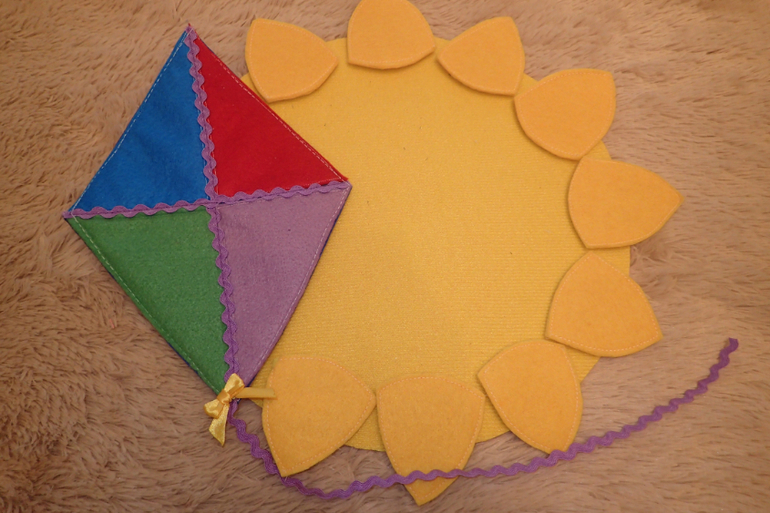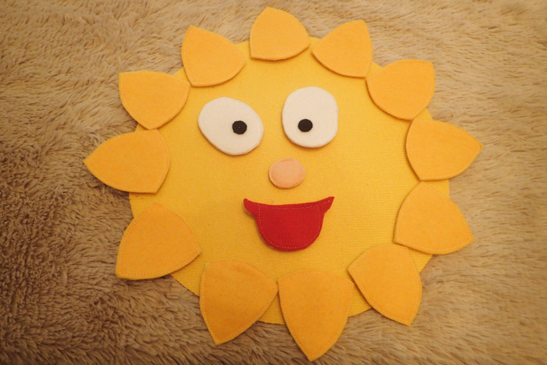 Основная часть состоит из велкро ткани. Поэтому к солнышку может крепиться все что угодна (и даже ботинки на липучках).