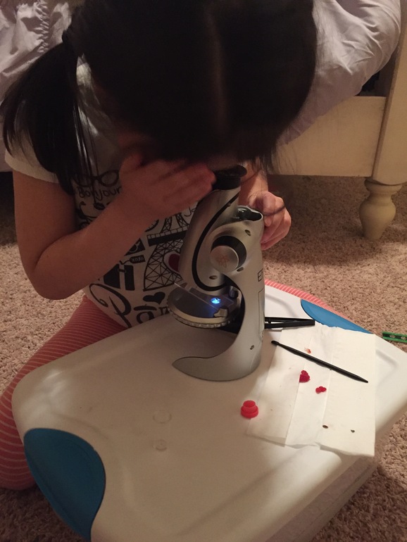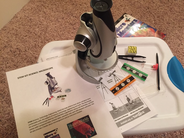 Взяли, в общем обычный такой детский микроскоп. В наборе микроскоп на батерейках (подсветка столика), предметные стекла, пробирка, чашка петри, увеличительное стекло, пинцет, какие-то стикеры и заламинированные части/органы каких-то насекомых и еще какие-то штуки, применение которых мне неизвестно. А еще в наборе (библиотека дополнила) две книжки - спрятанный мир и микро-монстры. Книжка про микромонстров действительно про монстров - про мелких насекомых типа клещей, клопов, вшей и их лечинок и прочую нечисть. Лена так внимательно слушала, рассуждала, когда я читала ей, что мне стало не по себе от того, что она теперь знает такие подробности, хотя знания конечно никогда не бывают лишними. Микроскоп судя по инструкции увеличивает в 150, 300 и 450 раз. Небольшой, обычный такой пластиковый, выглядит как игрушечный с колесиком, которое физически приближает и отдаляет предметный столик, колесико, которое меняет цвет подсветки столика и колесико переключающее между линзами увеличения 150х, 300х, 450х.