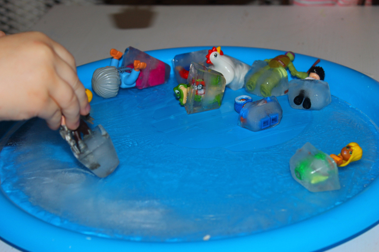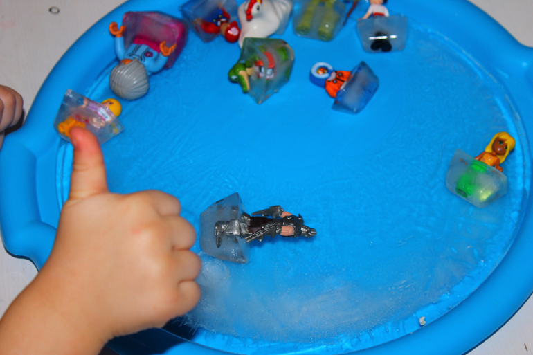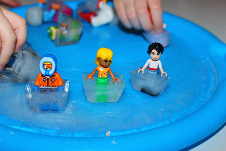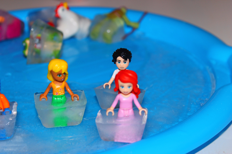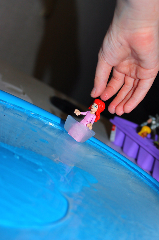 Каток -замороженая на подносе вода. Но поднос у нас стоял не очень ровно и заморозилась вода неравномерно, получилась даже небольшая горочка, игрушки сами скатывались с нее.