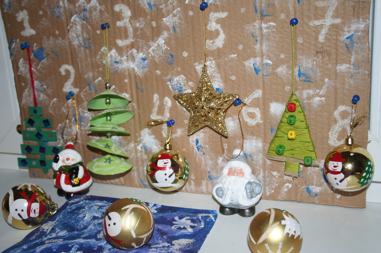 А еще каждый день мы будем наряжать нашу любимую елочку новыми игрушками, которые хранит мой простенький самодельный адвент из картона и солевых узоров. Их осталось уже семь :-)
