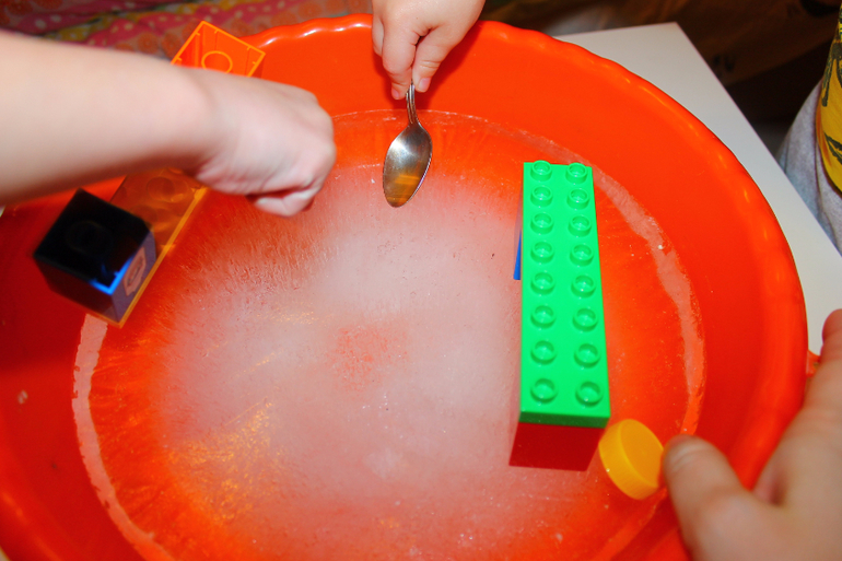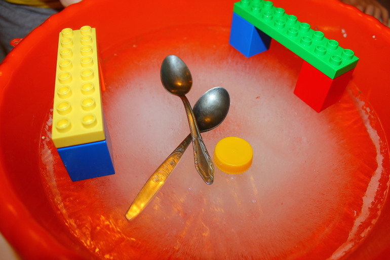 Наше поле-лёд в тазу, наши клюшки-чайные ложки, наша шайба- крышка от бутылки, а ворота сделали из лего. Игра получилась азартная.